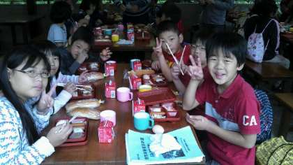 朝食タイムです。みさきの家の朝食は,パン,牛乳,ソーセージ,サラダ,ゆで卵,チーズ,ゼリーです。