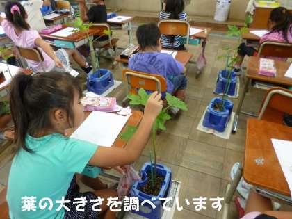今日は,教室に持ち込んで,葉っぱの大きさやつぼみを観察しました。