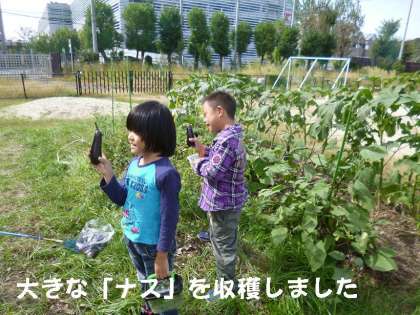 4組さんの畑の「ナス」「ミニトマト」は,まだ収穫できます。今日は,大きな「ナス」をたくさん収穫しました。