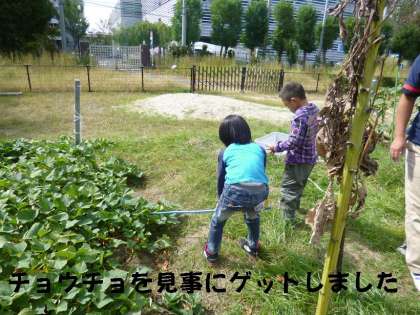 下学年の二人は,先生と一緒に学習園に行きました。夏から育てている野菜の収穫と生き物さがしです。