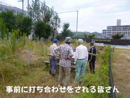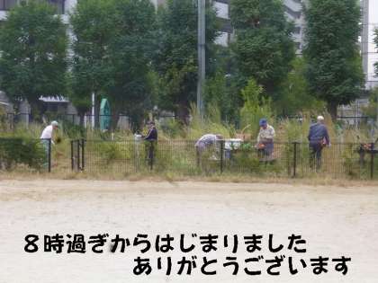 早朝より,自町連の会長さんをはじめ7名の方にきていただき,伸び放題になっている雑草を刈っていただいています。