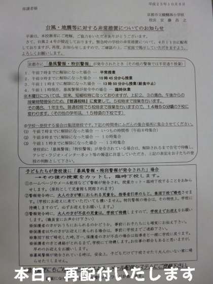 台風24号が接近しております。緊急時の学校の非常措置について,4月11日付で「台風・地震等に対する非常措置についてのお知らせ」を配付しておりますが,本日,再配付いたしますので,ご確認いただきますようお願いいたします。