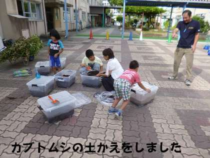 中庭で,教頭先生や管理用務員さんと一緒に,カブトムシの幼虫飼育ケースの土かえをしました。