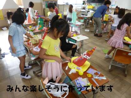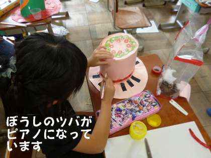 子どもたちは,いろいろアイデアを出して,一人一人オリジナルの「おしゃれなぼうし」を作っています。三角ぼうしあり,円柱ボウシあり,シルクハットありで,どれもかぶってみたくなる魅力あるぼうしができあがってきました。