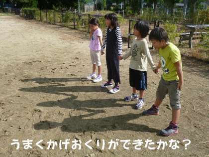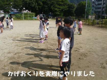 アルプラに社会見学に行った午後に,運動場に出て「かげおくり」をしました。