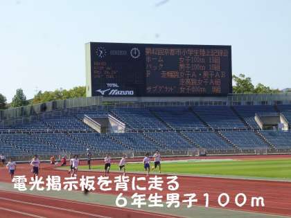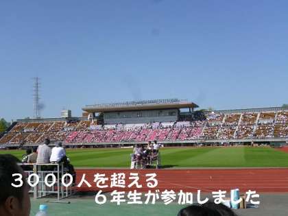 西京極陸上競技場には,京都市の小学校から6年生が3000人以上集まりました。  開会式後,男子100m(バックストレッチ)女子100m(ホームストレッチ)がはじまりました。