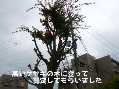 落ち葉の季節の前に剪定しなければ,お隣の王将さんやマンションの住人の方に迷惑がかかります。