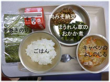 「ごはん」「キャベツのよしのじる」「ほうれん草のおかか煮」