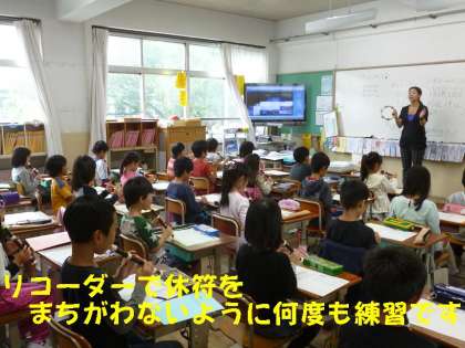 先生が吹くリコーダーの音を参考にして,みんなで休符等を見落とさないように,何度も繰り返し練習しています。