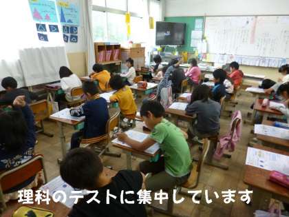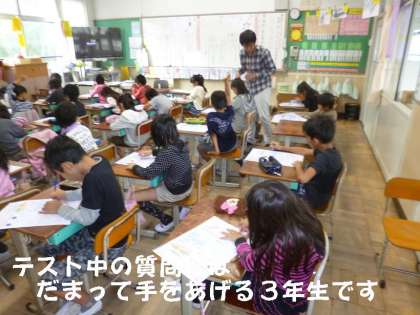 理科は専科の澤村先生に教えてもらっていますが,今日はテストにがんばりました。テスト中の質問は,静かにだまって手をあげます。しっかりルールが身についている3年生です。