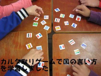 今日は,マシュー先生の来校日です。6年生は,英語での国の言い方を学習しました。国旗カードを使って,マシュー先生と発音練習をし,その後カルタ取りゲームでさらに慣れ親しみました。