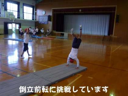 5年生も負けてはいられません。午後からの体育の時間に,「とびこみ前転」「側転」「倒立前転」など,高度な技に挑戦していました。