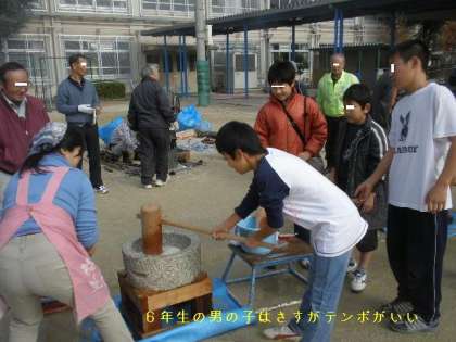 12時前には,80キロのもち米がすべてつきおわり,丸餅、ヨモギ餅、豆餅、あん餅になり,豚汁と一緒においしくいただきました。