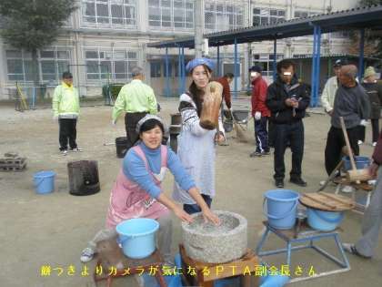 今年の「もちつき大会」は栗陵中学校のPTAの方も協力してくださり,地域女性会と一緒に「豚汁」を作ってくださいました。朝早くからありがとうございました。