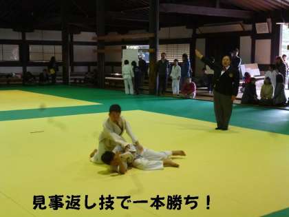 醍醐西っ子は2試合して,どちらも積極的に技をかけて攻めていきました。2試合目は少し押されていて,劣勢だったのですが,終盤に見事返し技(内また)で一本を取り,大逆転勝利でした。