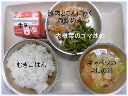 「豚肉とこんにゃくの炒め煮」「大根葉のゴマ炒め」