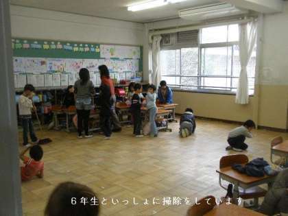 今年の6年生は,自主的に1年生の掃除を手伝ってくれています。やさしい6年生に,1年生の子どもたちはべったりです。