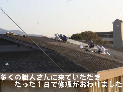 昨日,体育館の雨漏り改修工事をお知らせしましたが,たくさんの職人さんに来ていただき,たった1日で見事に修理していただきました。