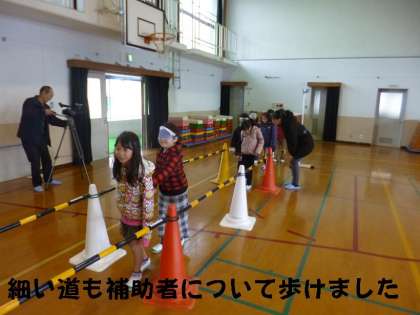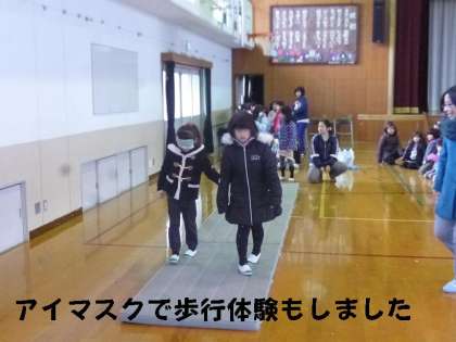 お話の後,実際にアイマスクをして歩行体験をしました。