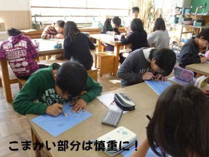 今年のテーマが世界遺産なので,子どもたちが選んだ景色や建物は,なかなか複雑で細かく彫らなければなりません。