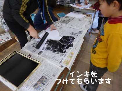 先生に手伝ってもらって,手をまっ黒にしながらも,一生懸命,紙に写し取っていました。