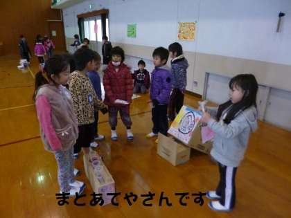 おみせやさんになったり,おきゃくさんになったり,とても意欲的な活動です。秋の遠足などでひろったどんぐりを有効活用した自主的学習でした。