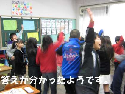 まず,教科書に出ている絵を使って3ヒントクイズに挑戦し,その後リレーゲーム(伝言ゲーム)を通して英語での言い方に慣れ親しみました。たくさんの単語が出てくる単元ですが,楽しく学習が進められています。