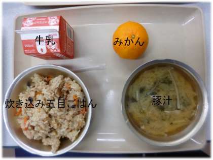 今日の「炊き込み五目ごはん」は,台風に備えて学校で保管しておいた米や缶詰,乾燥野菜などの乾物,まぐろフレークを使って作られています。