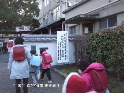年末年始特別警戒実施中の看板が校門前に掲示されています。私たちの街,醍醐から犯罪や事故がなくなるために,大人も子どもも一人一人が注意して,住みよい街作りをしたいものですね。「一人はみんなのために,みんなは一人のために!」