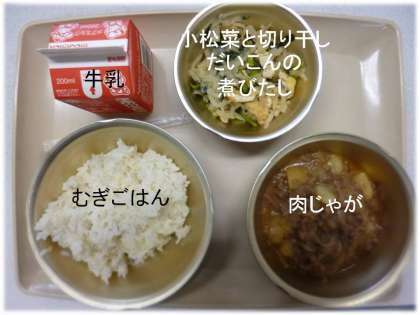 「むぎごはん」「肉じゃが」「牛乳」