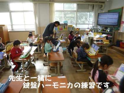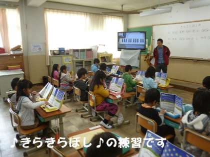 今日の音楽は,合同でなく各クラスでの学習でした。でも学習内容は一緒で,♪きらきらぼし♪を鍵盤ハーモニカで練習しました。