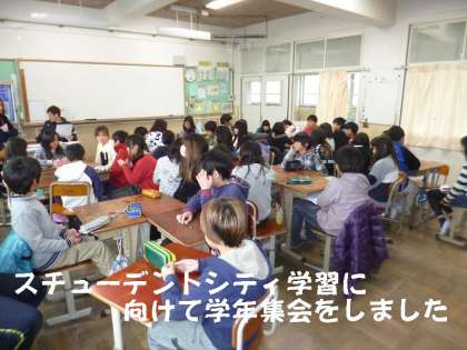 4時間目にスチューデントシティー学習(1/17実施)に向けての学年集会をしました。もう,当日の役割分担も決まっています。