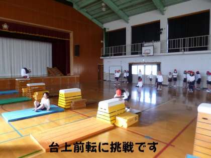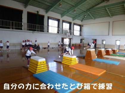 今日は,しっかりアップして体をあたためてから,自分の技量に合ったとび箱を使って開脚跳び,閉脚跳び,台上前転の練習をしました。