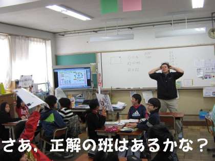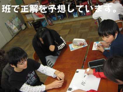 今日は,マシュー先生の来校日です。6年生は,時刻の言い方を学習しています。最初にマシュー先生と復習をした後,ゲームを通して時刻の言い方に慣れ親しみました。班ごとに予想を考え,一斉に予想を掲げました。正解の多かった班は,全問正解でした。