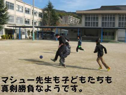 今日は,マシュー先生は6年生と給食を食べました。給食時間に,子どもたちの方から“Let's play soccer!”と誘いかけ,昼休みにいっしょに楽しみました。