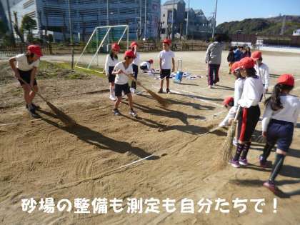 着地地点の砂場の整備も跳んだ距離の測定も,自分たちでやりました。