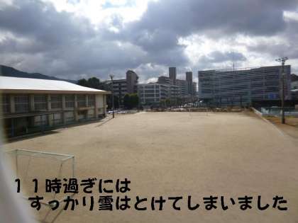 朝,7時半現在,運動場には,約3センチの積雪があったのですが,11時過ぎにはすっかりとけてしましました。体育館の屋根は,まだ真っ白です。