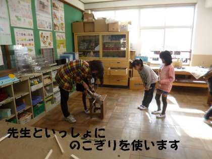 のこぎりやくぎ打ちにも挑戦します。子どもたちは,楽しそうに友だちと「ああでもないこうでもない・・」と言いながらも生き生きとした表情で作りはじめています。