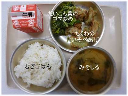「だいこん葉のゴマ炒め」「ちくわのいそべあげ」「牛乳」