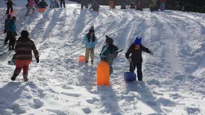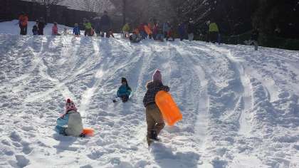 花背山の家の施設内の坂を利用して,早速,雪遊びを始めました。