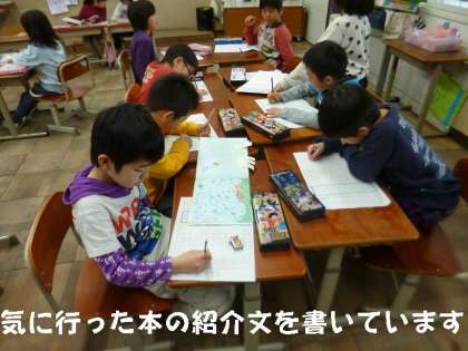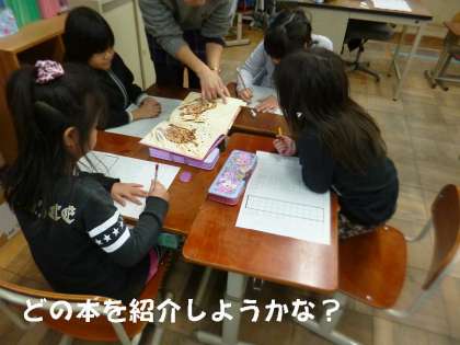 「スーホの白い馬」の学習で紹介文の書き方を勉強したので,すらすらと書けるようになっています。しかし,気にいった本がいっぱいあって決めかねている子どもたちもいるようです。