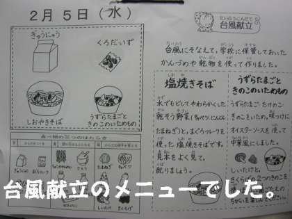 今日は,台風に備えて学校に保管していた食材で作られたメニューでした。午後からの授業参観に向けて,しっかり食べてがんばります。