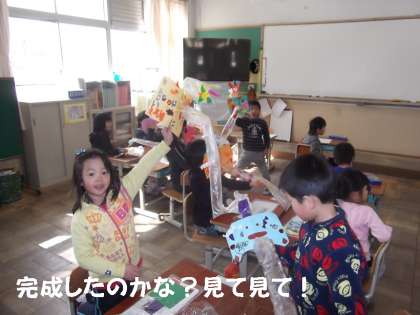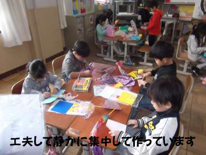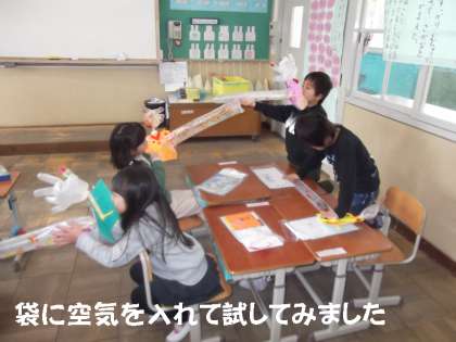 図工でビニールの袋や手袋をお面につけて,吹きだしお面を作っています。みんな楽しそうに作っている最中に,ストローで空気を入れて,ためしながら作っていました。