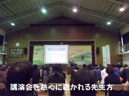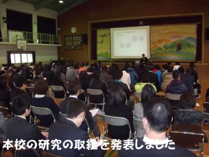 公開授業後は,参会者の先生方に本校の研究の取組を発表し,そして,本校が目指している授業のユニバーサルデザイン(どの子もわかる,参加できる授業の進め方)についての研修会を実施しました。授業のユニバーサルデザインの創始者である先生をお招きして,ご講演をいただき,具体的な授業の進め方のお話を聴かせていただきました。
