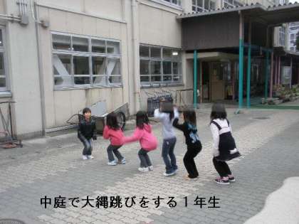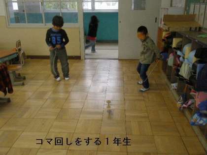 1年生は,休み時間になると,一斉に運動場に飛び出していきます。サッカーやドッジボールが大好きです。でも時には,教室に残って「コマ回し」をしたり中庭で「大縄跳び」をしたりすることもあります。子どもたちは,思い思いの遊びを通じて良き友だち関係を構築しています。