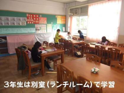 今日は,1,2年生で図書室が満室になり,遅れてきた3年生は,となりのランチルームで学習しました。