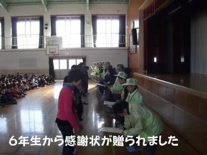 3月の朝会で,1年間お世話になった「子ども見まもり隊」のみなさんに感謝状贈呈式を行いました。