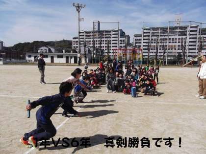 最後は,全員リレーです。1年生は,6年生より7〜8人,人数が少ないです。だから,6年生は真剣に走らないと負けてしまいます。