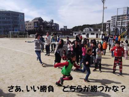 さあ,勝負です。一人運動場1周走ってリレーしました。
