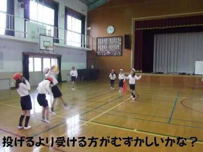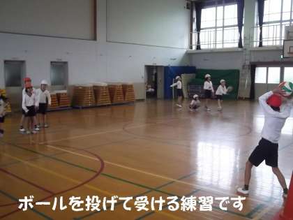 楽しみにしていた「キックベース」が雨でできなくなったので,体育館で「ボール運動」をしました。バレーボールを投げては受ける!どの班が失敗せずに長く続けられるか?競っていました。